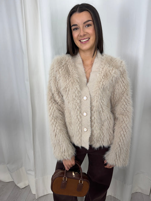 Beige Faux Fur Button Up Cardigan